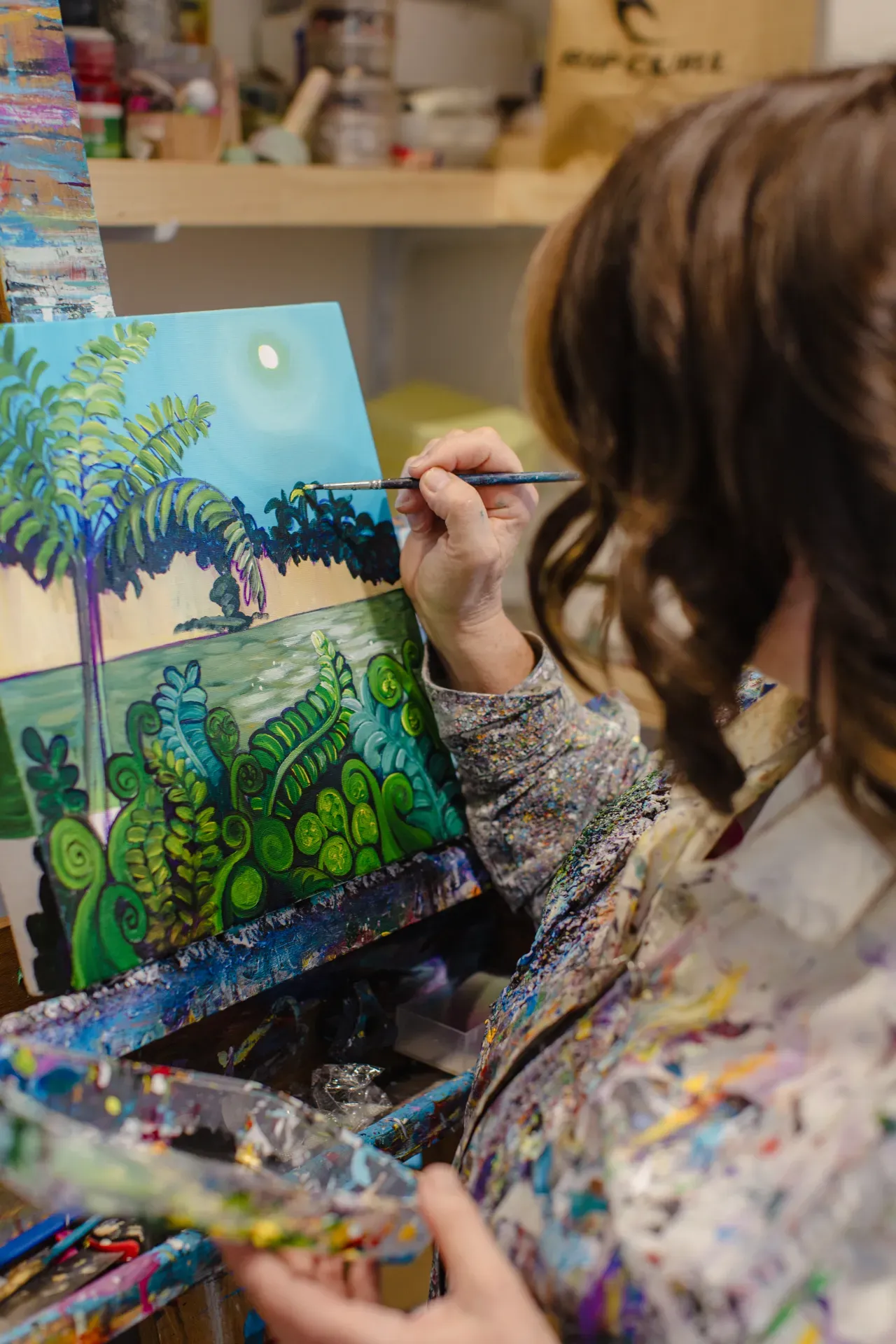 The wanderlust gripped me, leading to years spent traveling and working abroad. In Denmark, I had my debut solo exhibit and painted murals for a kindergarten, with the kids helping me improve my Danish as I worked. Across Africa, I exchanged my art for accommodation, food, and occasional money. Art has guided my adventurous journey, leading me to settle in Whanganui upon my return to New Zealand. There, I opened my own shop/gallery, where I sold my creations for 7 1/2 years. Transitioning to motherhood, I closed the shop but continued my business by attending major markets nationwide, baby strapped to my front. Now, I operate from home, selling through events, venues, and my website.